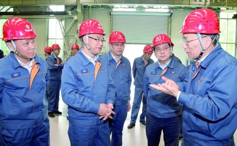 5月12日上午,太钢集团党委书记、董事长盛更红带领党委中心组(扩大)成员在精密带钢公司重走习近平总书记考察调研之路。 王旭宏摄