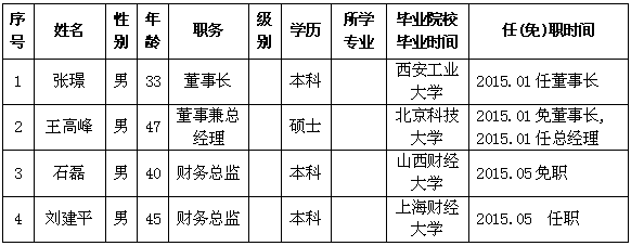内容:公司董事会选举通过张璟为公司董事长,并担任公司法定代表人。免去王高峰的董事长兼法定代表人职务。解聘吴连生总经理职务,聘任王高峰担任总经理。