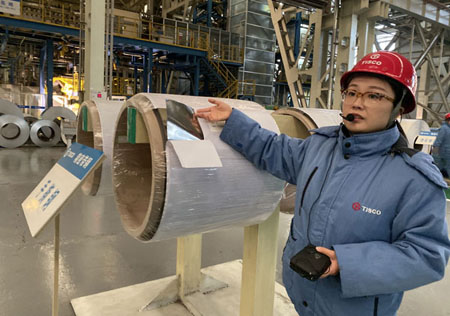 太钢不锈钢精密带钢有限公司工作人员介绍“手撕钢”。人民网记者杜燕飞摄