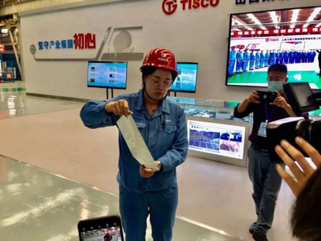 当日,由中央网信办传播局主办、中部六省网信办协办的“中部崛起势正劲”网络主题活动山西站第一时间来到太钢精带车间,采访团的记者们抢先一睹2.0版“手撕钢”的风采。
