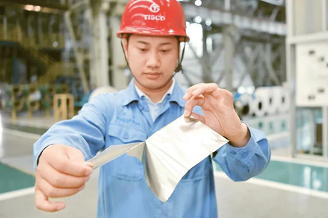 它薄如蝉翼,厚度只有0.02mm,不到A4纸的1/4,它的学名叫宽幅软态不锈钢精密箔材,是山西太钢不锈钢精密带钢有限公司出品的新产品,因可以用手轻易撕开,被形象地称为“手撕钢”。